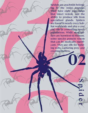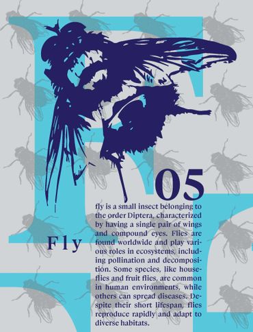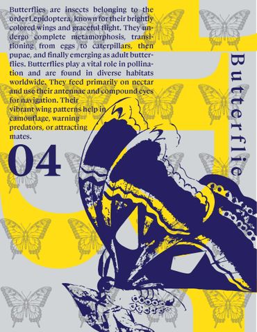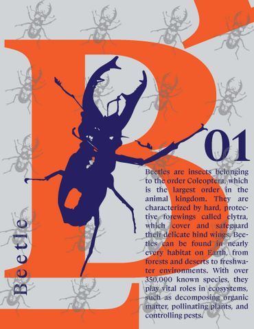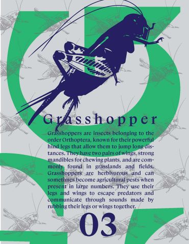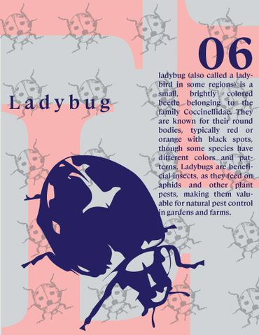 This is an insect series poster. I used six different insects to create six posters. Each poster contains an introduction to the insect. The initials of the insect's name serve as the background of the poster.